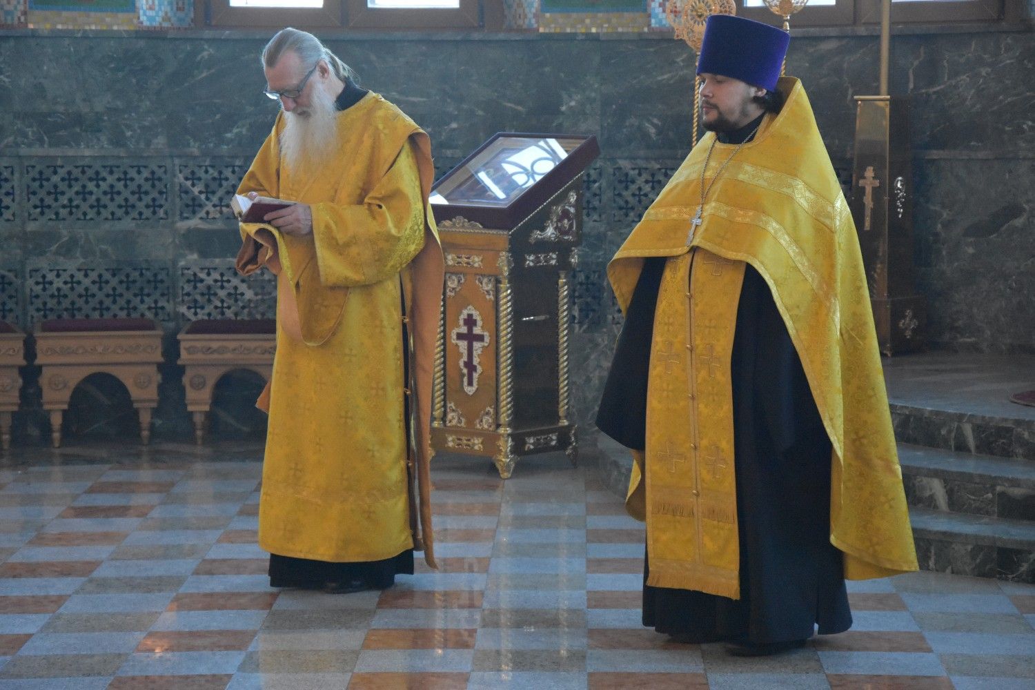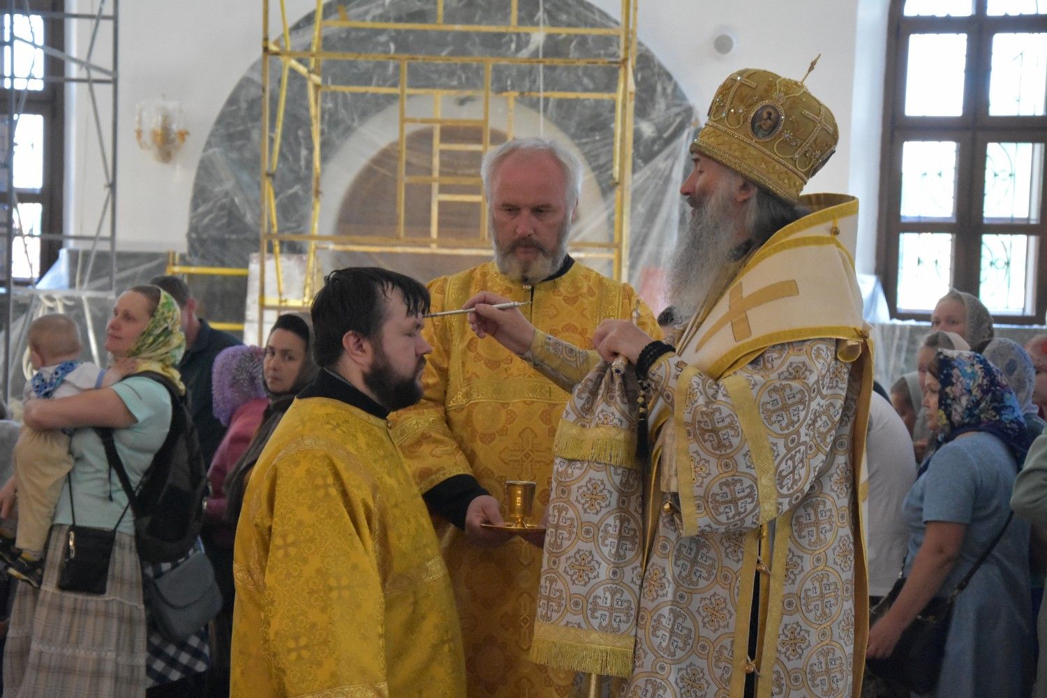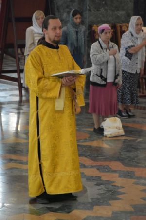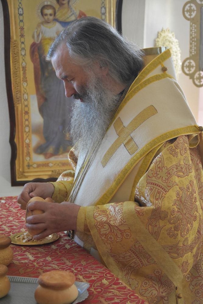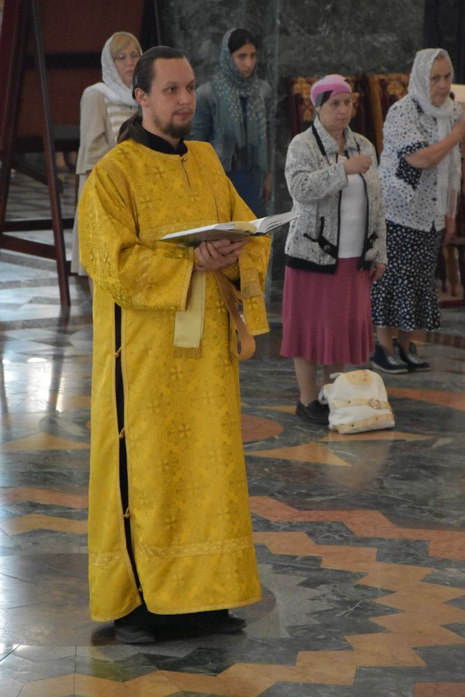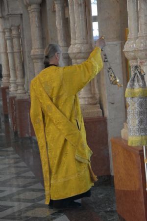 Владыке сослужили ключарь собора протоиерей Сергий Поглазов, клирики собора иерей Никифор Захаров, иерей Артемий Промович, диакон Игорь Коваль и клирик храма Рождества Пресвятой Богородицы села Семеновка протодиакон Михаил Козловский.