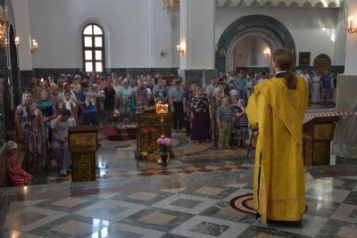 Его Высокопреосвященству сослужил ключарь собора протоиерей Сергий Поглазов, диаконы собора Андрей Дружинин и Игорь Коваль и клирик храма Рождества Пресвятой Богородицы с. Семеновка протодиакон Михаил Козловский.