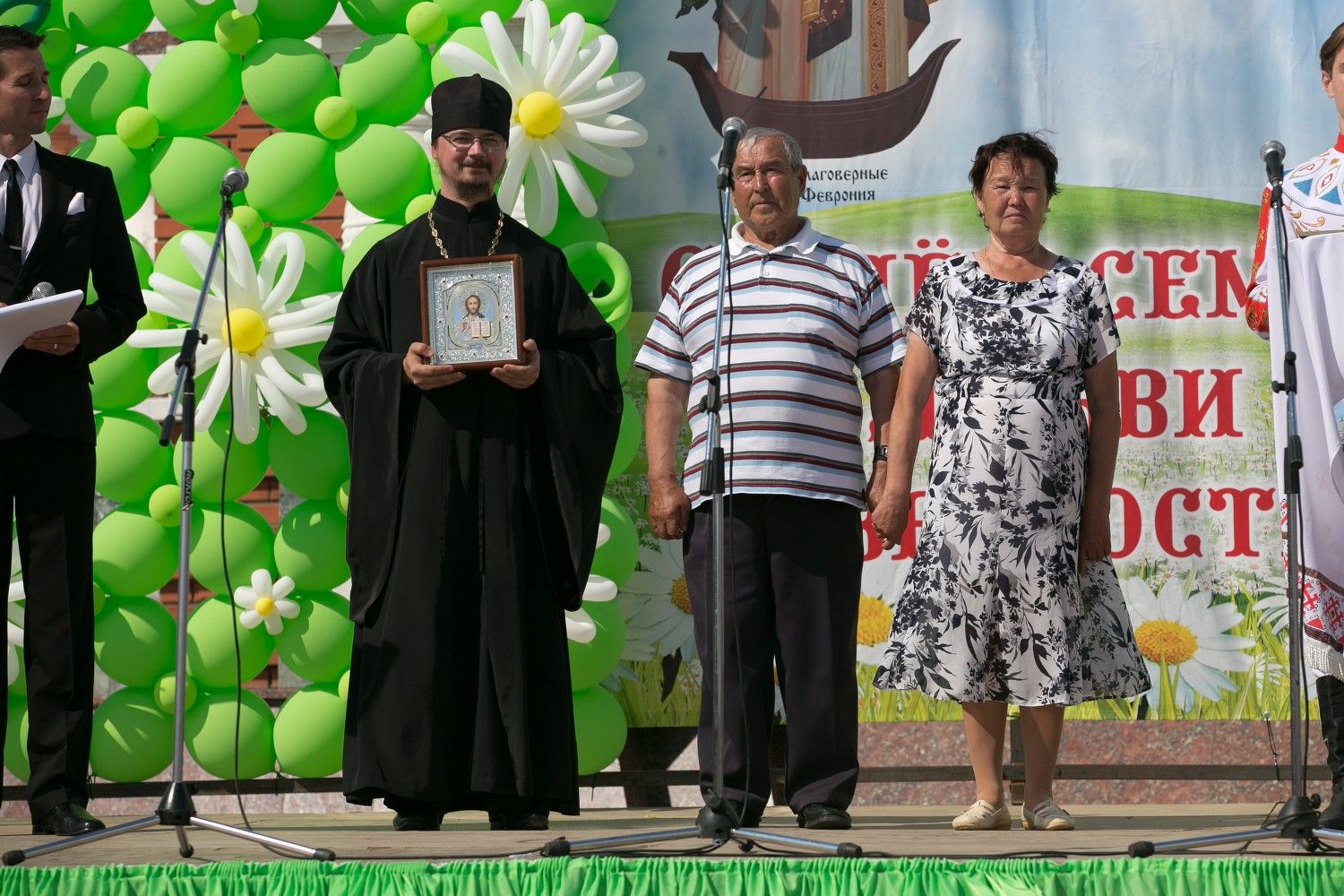 В 13.00 на главной сцене состоялось торжественное открытие праздника – «Дня семьи, любви и верности». От Правительства Республики с приветственным словом выступила Заместитель Председателя Правительства РМЭ Илга Дравниеце. От Марийской митрополии поздравил с праздником всех присутствующих секретарь Йошкар-Олинского епархиального управления иеромонах Серафим (Пасанаев).