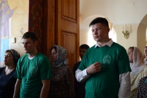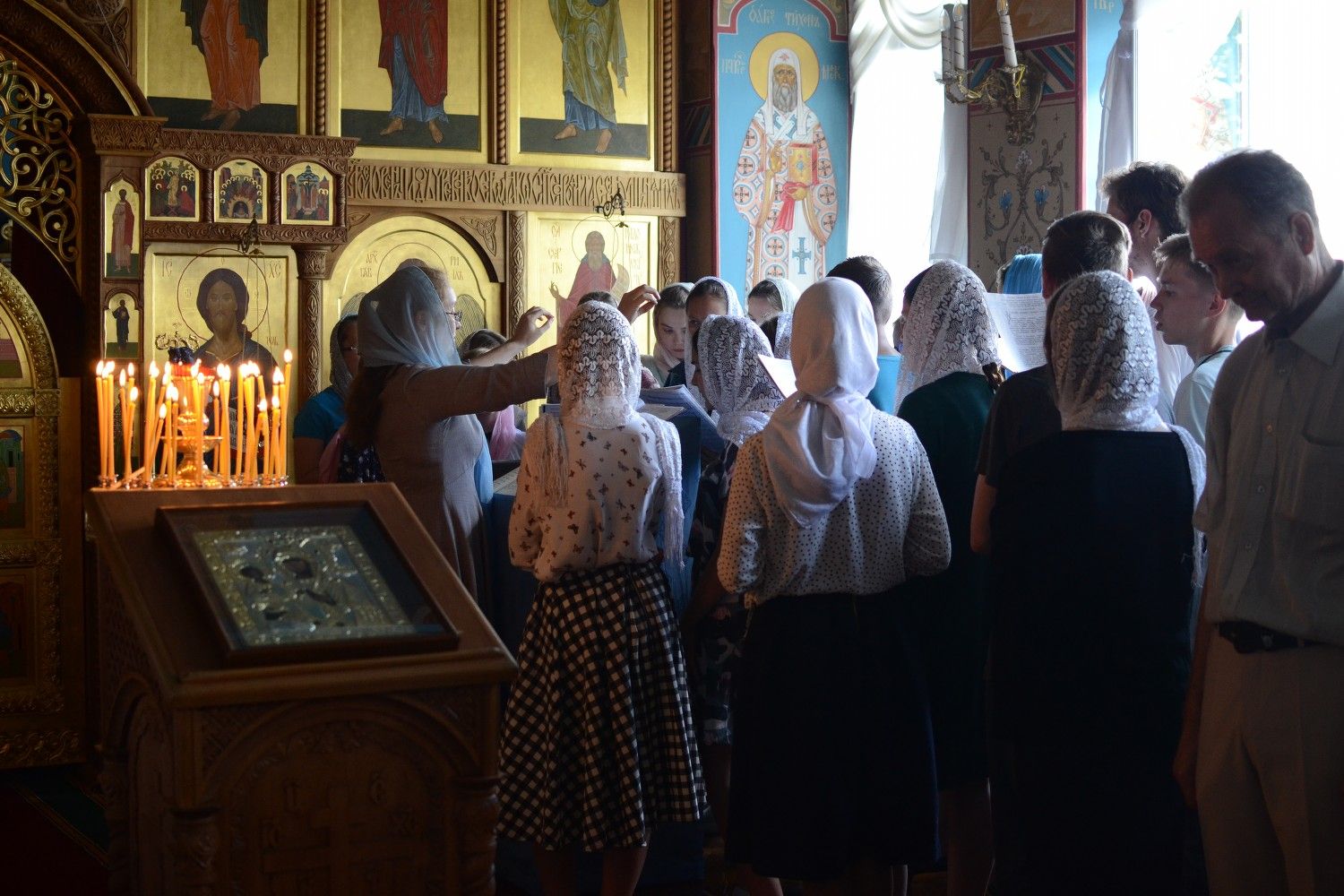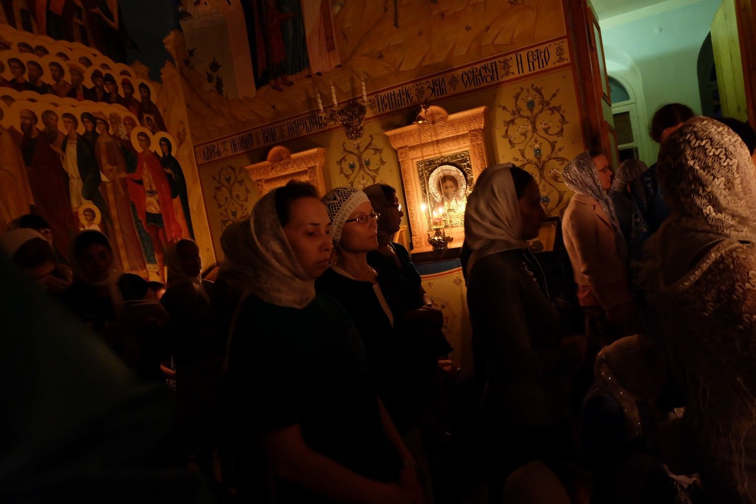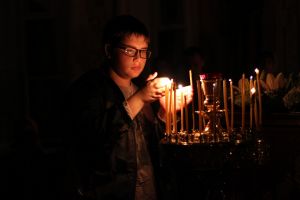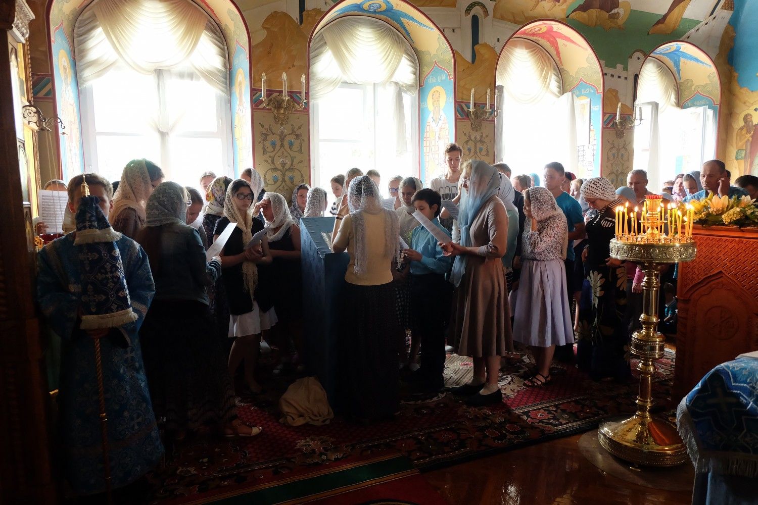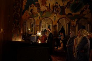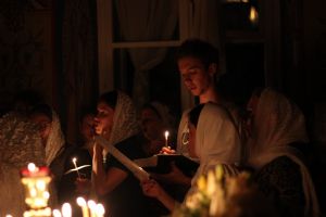 Звучал особый напев богослужебных песнопений в исполнении детско-юношеского хора «Благовест». Многие из них на греческом языке. Храм освящен только горящими свечами. Все это настраивает людей, пришедших прославить Пресвятую Богородицу, на особый молитвенный лад. Несмотря на то, что служба длинная и совершалась почти до утра, в храме было много детей.