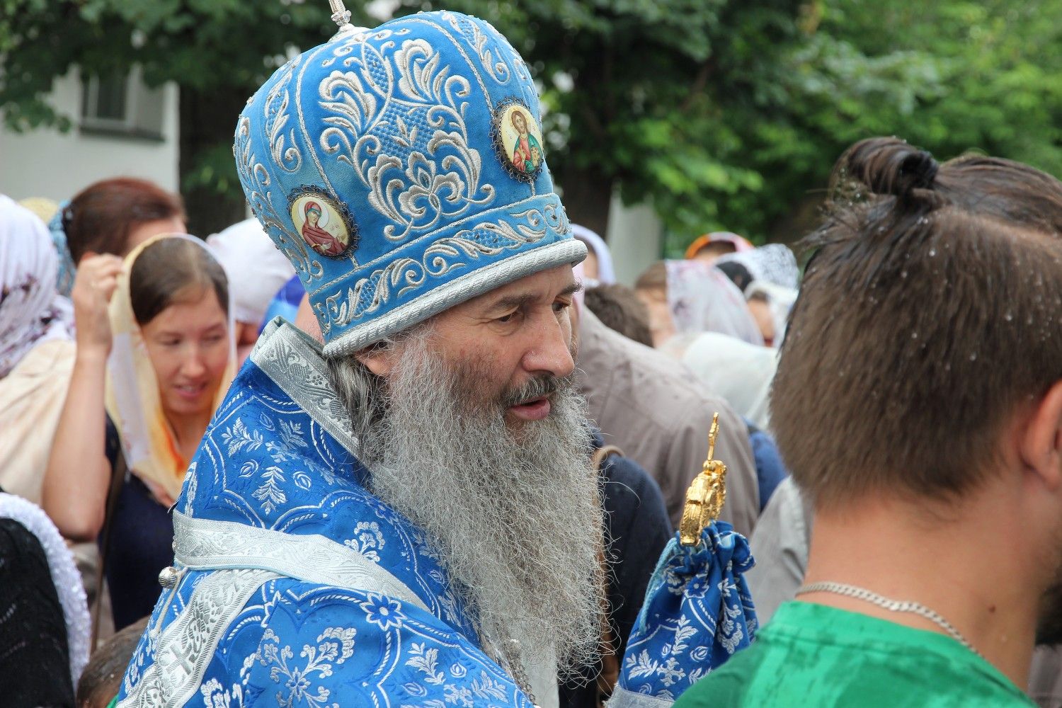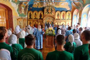 После небольшого перерыва, рано утром, началась Божественная литургия. Почти все многочисленные прихожане приобщились Святых Христовых Таин. В честь престольного праздника вокруг здания Епархиального управления прошел крестный ход. Владыка щедро окропил всех святой водой, а после крестного хода обратился к пастве с проповедью.