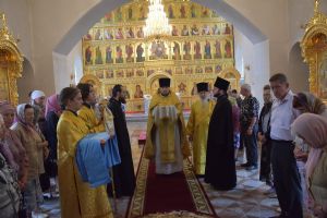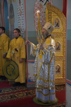 Владыке сослужили: клирик храма иерей Константин Домрачев и клирик храма Рождества Пресвятой Богородицы села Семеновка протодиакон Михаил Козловский.