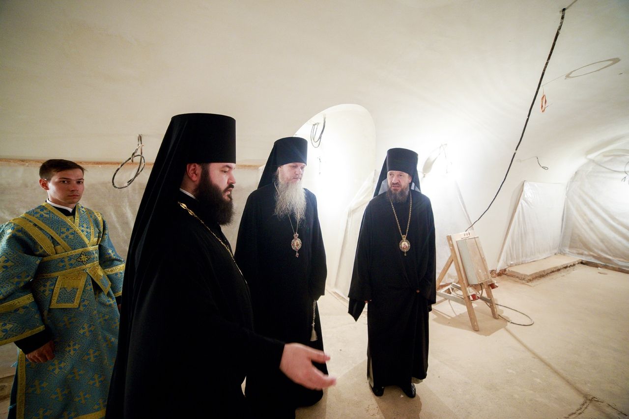 Перед началом праздничного богослужения глава Татарстанской митрополии ознакомил архипастырей с ходом воссоздания собора Казанской иконы Божией Матери, в том числе, Пещерного храма.