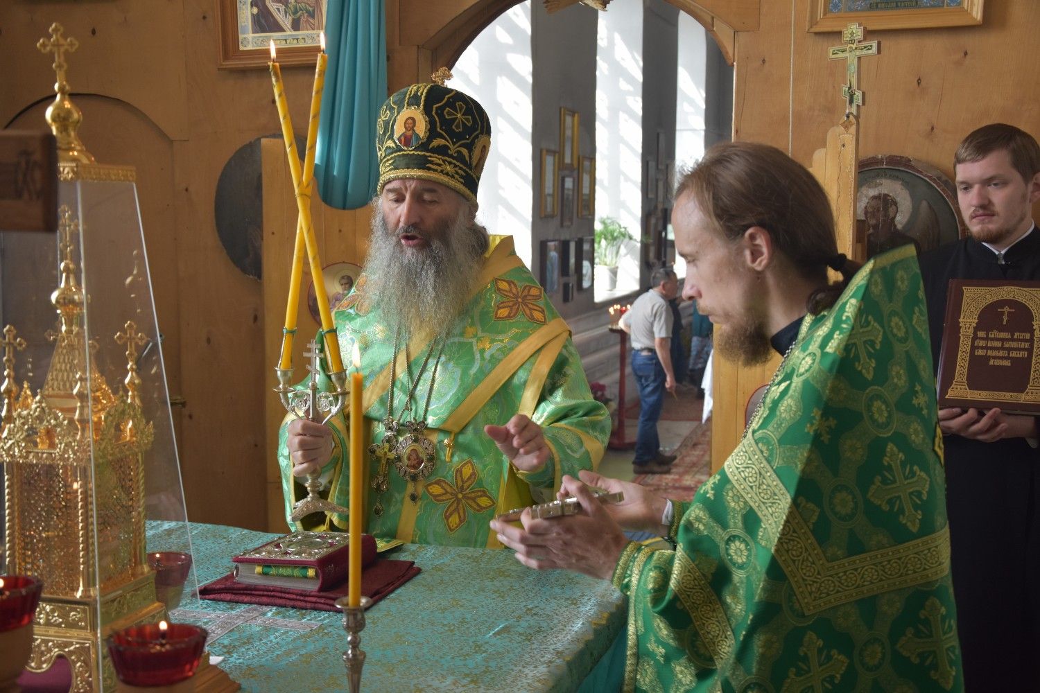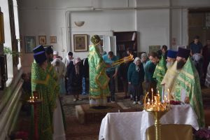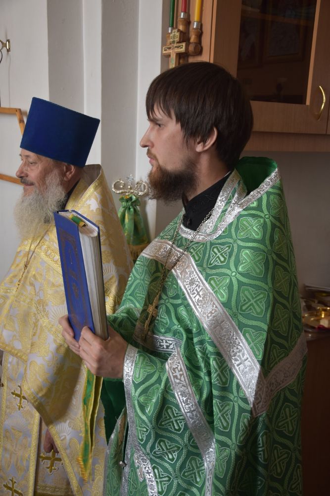 Владыке сослужили секретарь Йошкар-Олинского епархиального управления иеромонах Серафим (Пасанаев), настоятель храма иерей Евгений Хованский, благочинный Северо-Западного церковного округа протоиерей Андрей Романов, настоятель храма Покрова Пресвятой Богородицы села Упша протоиерей Михаил Нехорошков, настоятель храма Рождества Иоанна Предтечи поселка Оршанка иерей Димитрий Вылекжанин, настоятель Сретенского храма села Кучки протоиерей Алексей Вязов, настоятель Вознесенского храма села Шулка иерей Евгений Беляев, клирик храма пророка Илии поселка Килемары Димитрий Васенев и клирик храма Рождества Пресвятой Богородицы села Семеновка протодиакон Михаил Козловский.