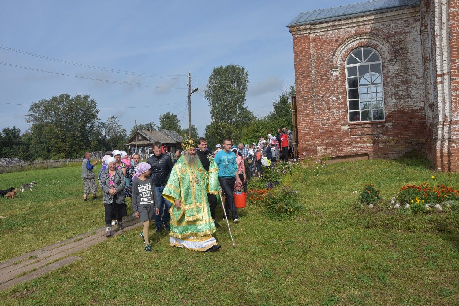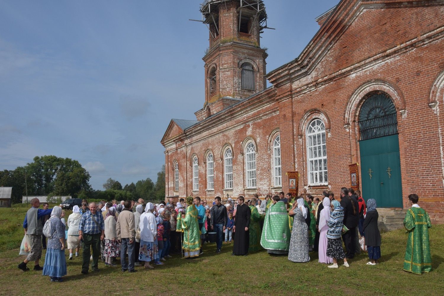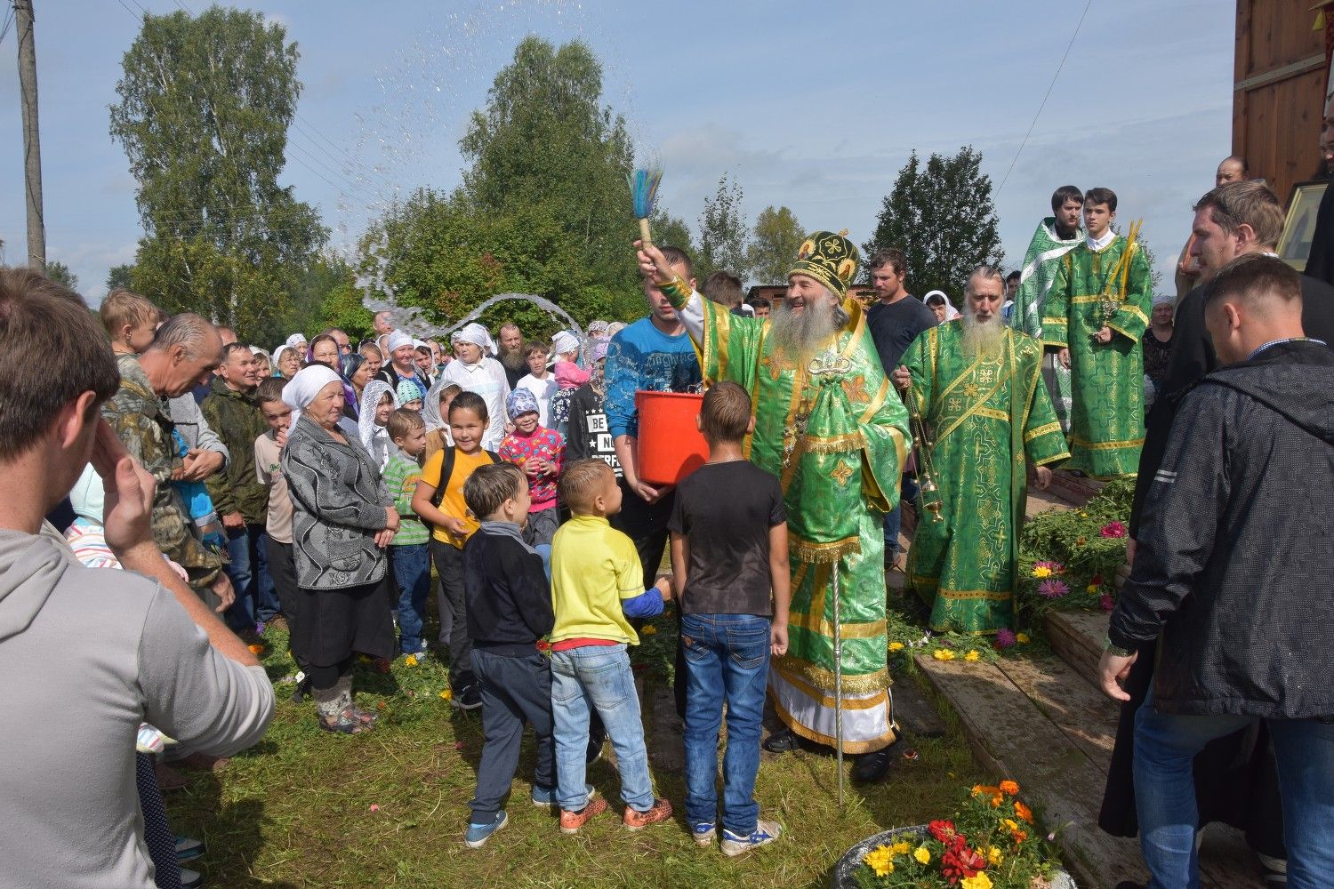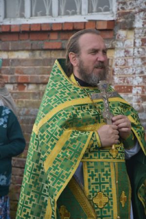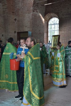 После литургии прошел крестный ход вокруг храма с кроплением святой водой и чтением Евангелия.