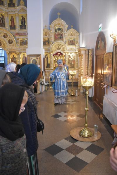 Богослужение началось торжественной встречей архиерея. Песнопения исполнял хор под руководством регента Наталии Поповой. За Литургией вознесли особые молитвы о мире в Украине и единении Православной Церкви.