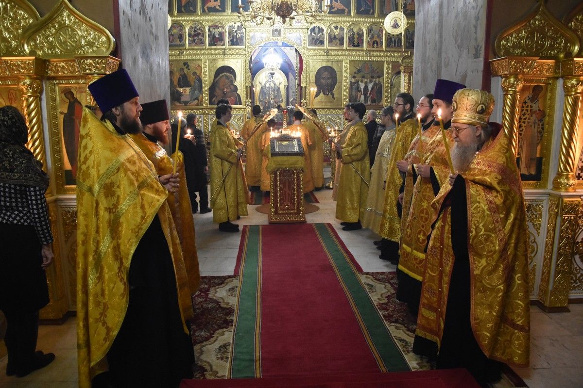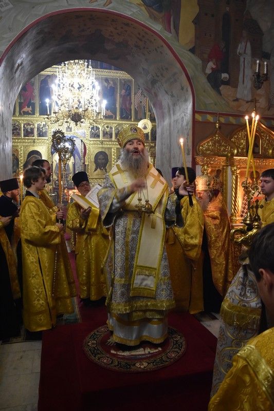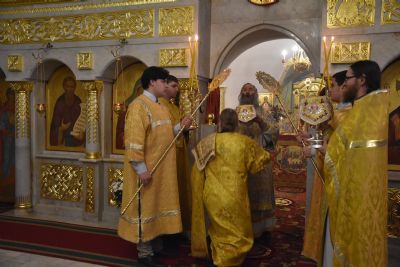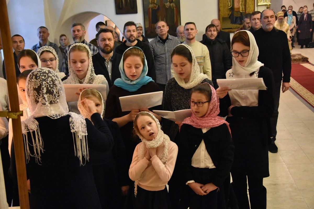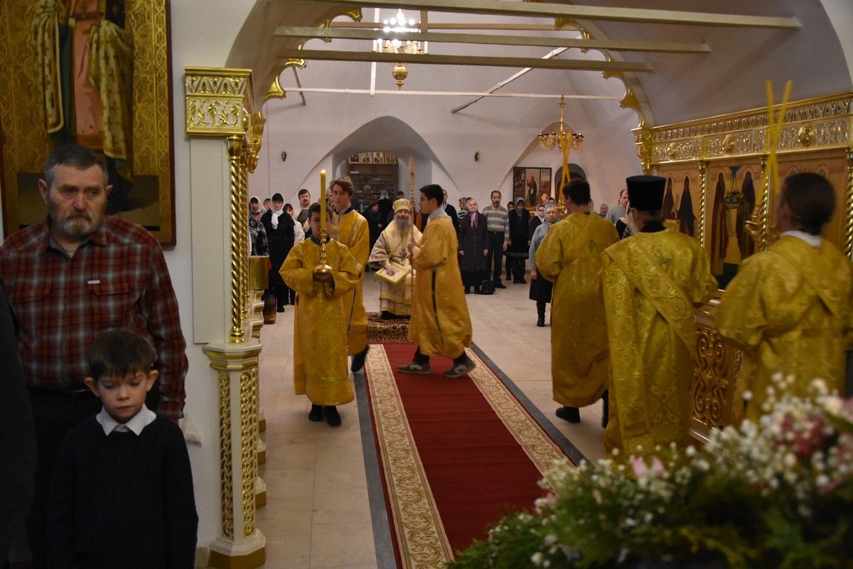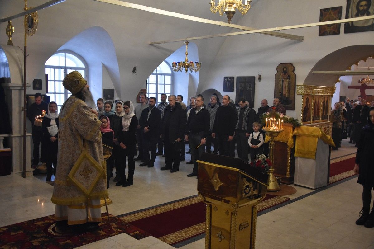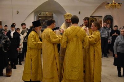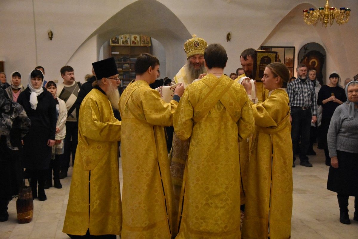 Владыке сослужили настоятель собора митрофорный протоиерей Евгений Кутырев, благочинный Йошкар-Олинского церковного округа протоиерей Андрей Норкин, клирики собора иерей Владимир Камышев, иерей Димитрий Копылов, клирик храма Рождества Пресвятой Богородицы с. Семеновка протодиакон Михаил Козловский.