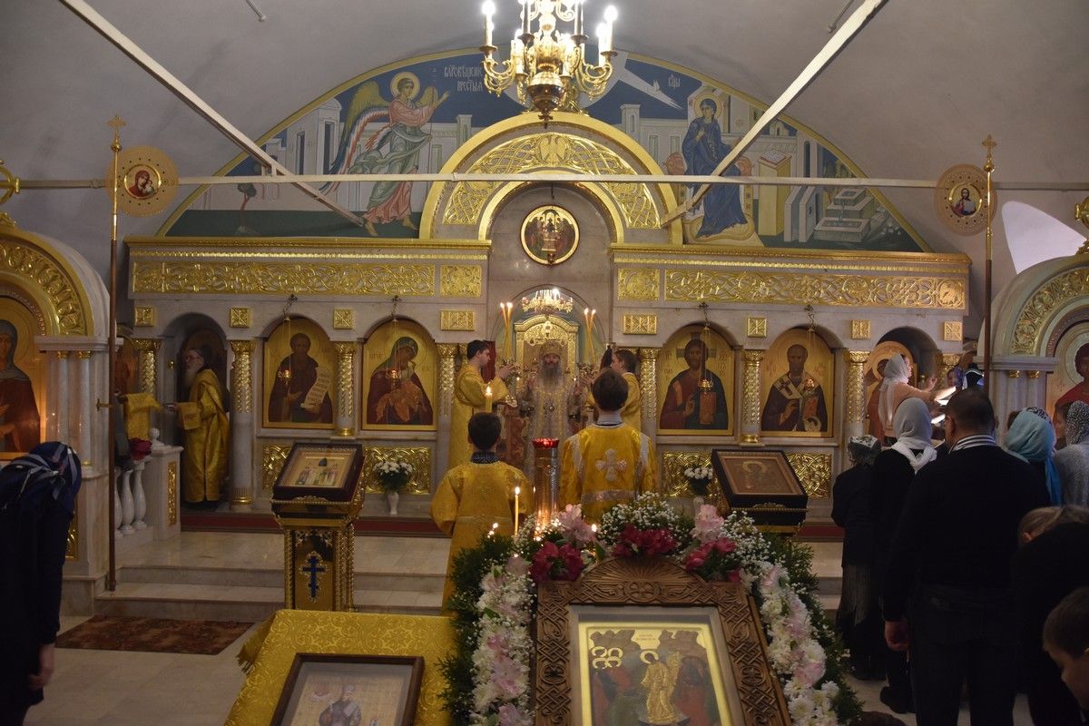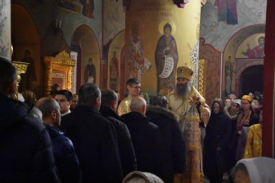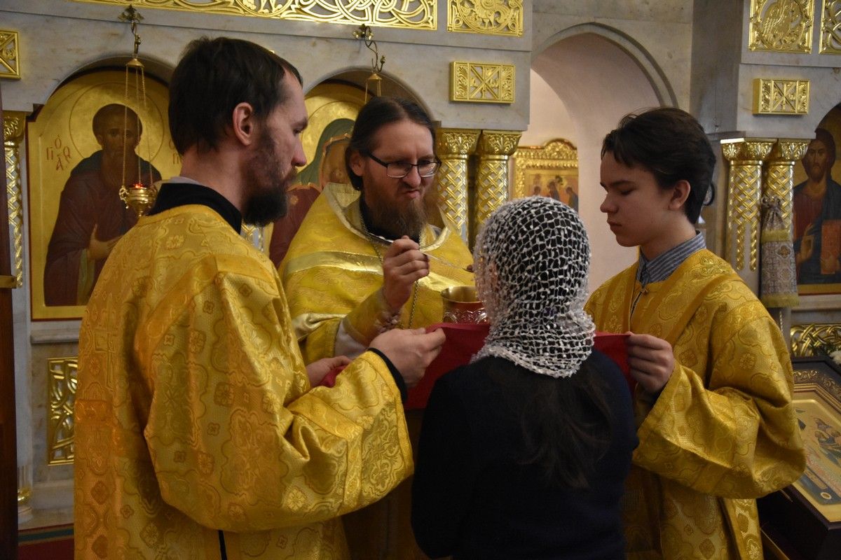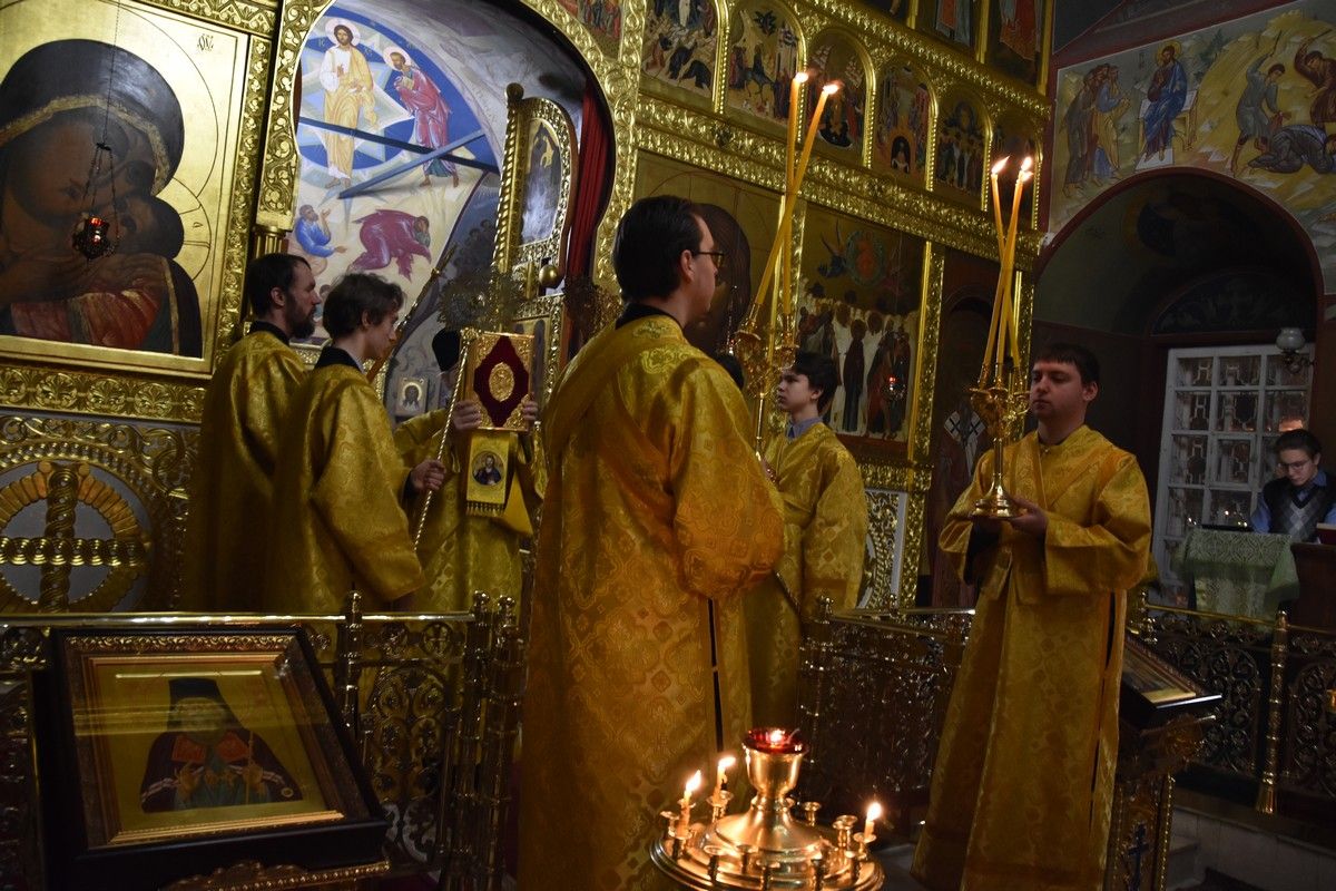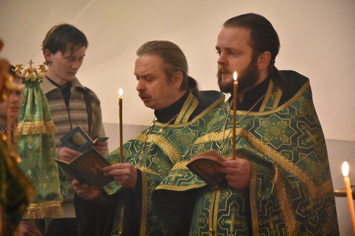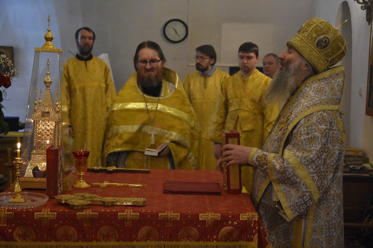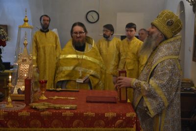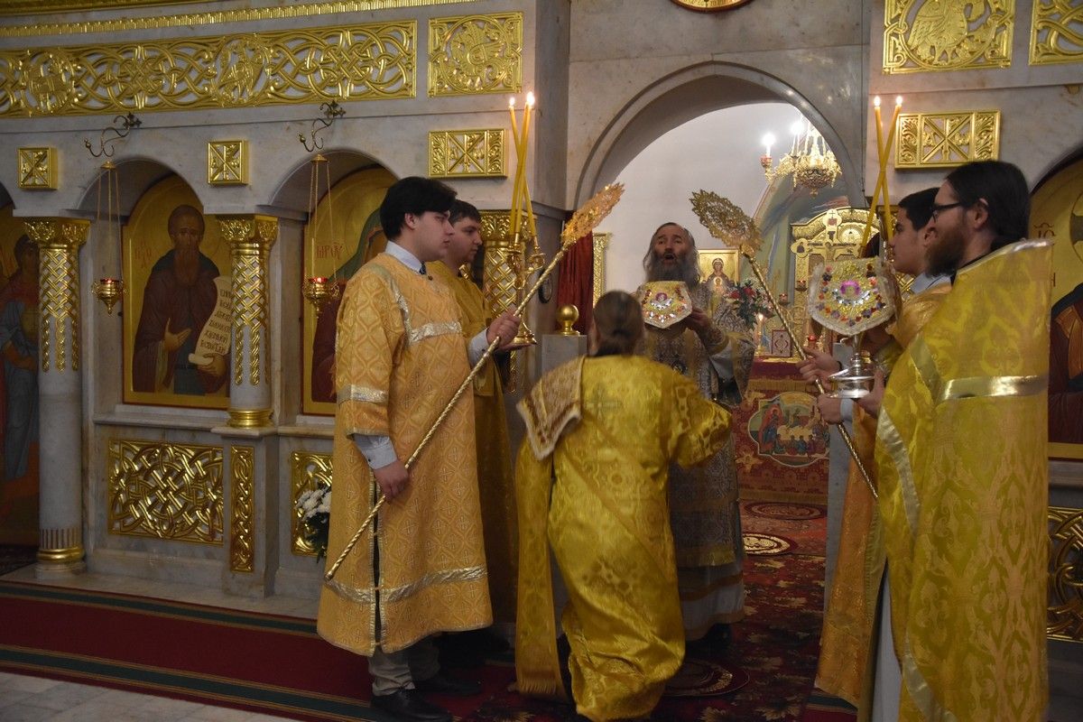 Владыке сослужили настоятель собора митрофорный протоиерей Евгений Кутырев, благочинный Йошкар-Олинского церковного округа протоиерей Андрей Норкин, клирики собора иерей Владимир Камышев, иерей Димитрий Копылов, клирик храма Рождества Пресвятой Богородицы с. Семеновка протодиакон Михаил Козловский.
