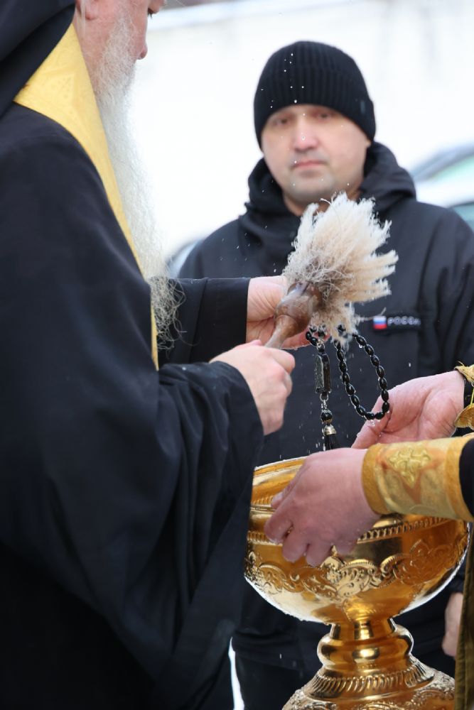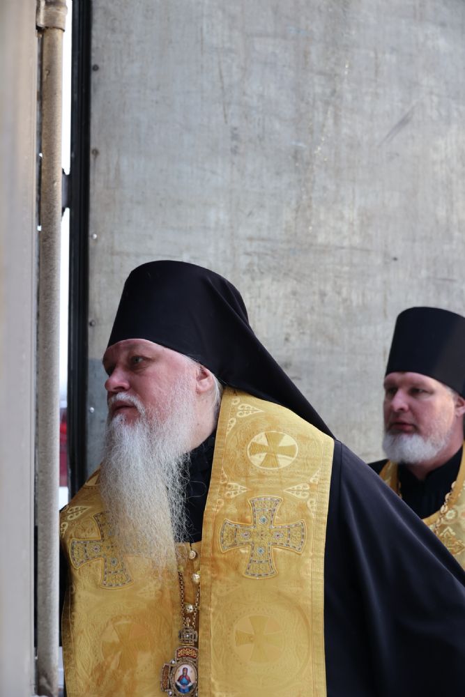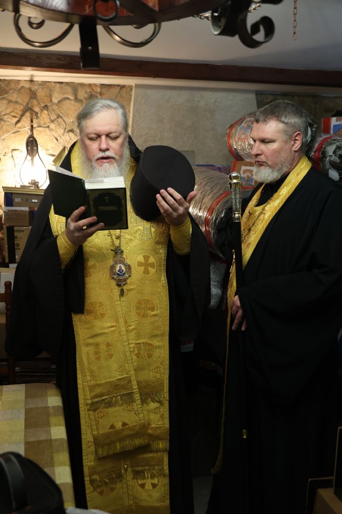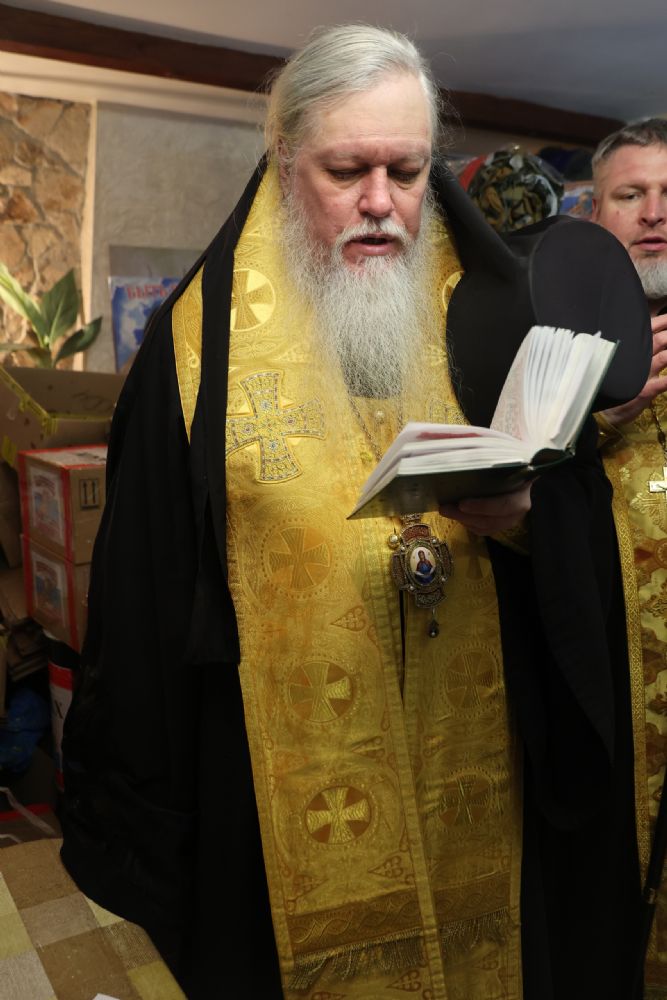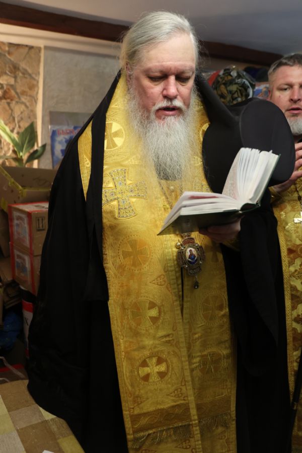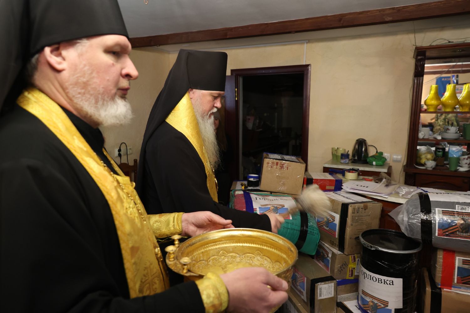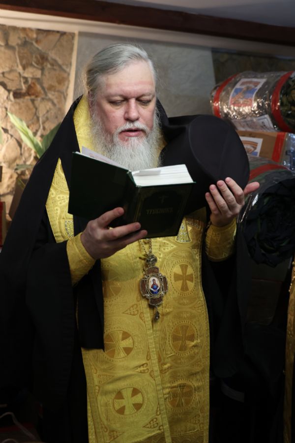 Перед отправкой партии гуманитарного груза епископ Феофан в сослужении руководителя отдела социального служения и церковной благотворительности Волжской епархии иерея Виталия Ульянова и руководителя епархиального информационно-издательского отдела иеромонаха Александра (Чеборова) совершил молебное пение.