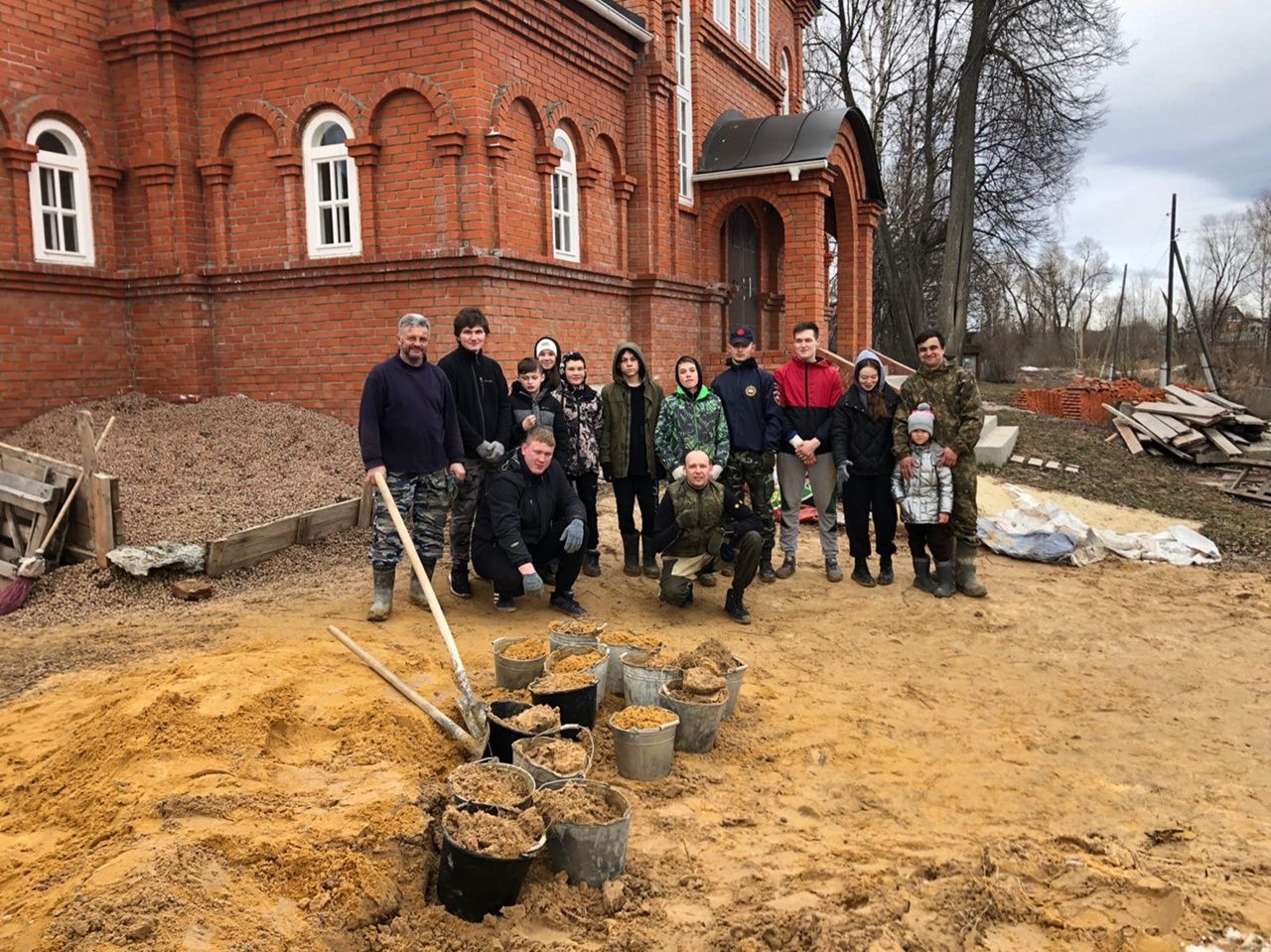 16 апреля воспитанники спортивного клуба «Рать» заполняли песком пустоты между кирпичной кладкой основания стен крестильни - было перенесено более 30 тонн песка.